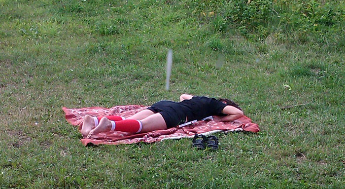 Po powrocie do Grzybna, wygłodniali i senni rzuciliśmy się najpierw do spiżarni, a potem na sjestę. Kamowa poszła spać u siebie w pokoju, Wojtek oglądał film na ganku domu, a ja.. no cóż.. ja zaliczyłam kimę w stylu “robię pompki tylko chwilę odpoczywam” na kocu w ogrodzie. Do przetestowania na siłce!! 😉 Niestety Kamowej udało się uwiecznić ten spektakularny zgon na zdjęciu. W sumie to aż dziwne, że udało mi się na chwilę zasnąć- stało się to dopiero wtedy, kiedy Wojtek zabrał do domu moje psy, bo wcześniej Rasta biegała po dworze i pomiaukiwała (wystarczy że Wojtek na nią spojrzy, ona już myśli że zaraz będzie jej coś rzucał albo każe jej zrobić kółko, więc zaczyna śpiewać), a Smok w dwie minuty znalazł trzy piłki, postanowił mi je wszystkie przynieść i po kolei mi je podawać. A raczej podawać je mojej głowie.