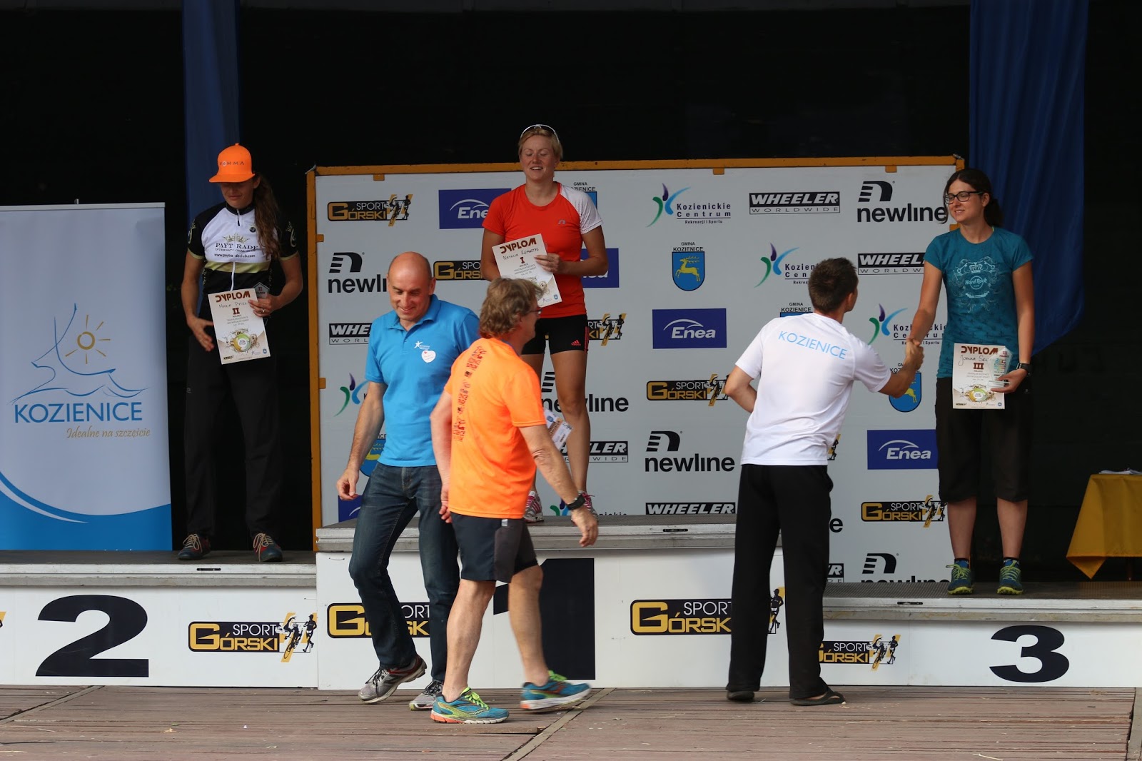 No i bieg, czyli chwila grozy – zbombię czy nie zbombię? Niestety doświadczenia z zeszłego roku (gigantyczna kolka przez cały dystans – dusząca, zatrzymująca i masakrująca mnie doszczętnie) zostawiły we mnie taki uraz i strach, że do większego wysiłku doprowadzam się na treningu niż na zawodach… Wiem że mogę biec szybciej, ale boję się, że jeszcze dwa kroki i będzie to, co było rok temu, a wtedy mam pozamiatane, a w bonusie bezsensownie się nacierpię. Wszystko jednak wskazuje na to, że moje wielokierunkowe zabiegi (opiszę je w oddzielnym wpisie) pomogły i w przyszłym roku nie powinnam już mieć problemu mentalnego tej natury. Już w Rawie nie było najgorzej, w Kozienicach było nawet nieźle. Ze względu na specyfikę trasy – krossowa, po leśnej ściółce – nie miałam okazji sprawdzić, ile dam radę poginać na płaskim (i po raz pierwszy musiałam użerać się w strefie zmian ze skarpetkami – piasek i szyszki na mokrych stopach mogłyby spowodować, że w Białym nie byłabym w stanie w ogóle biec), ale ta okazja miała pojawić się już następnego dnia w Białymstoku. Tak czy inaczej – do mety dotarłam w niezłym zdrowiu i samopoczuciu z czasem 1:05:cośtam, zajmując szóste miejsce wśród kobiet (trzecie w kategorii wiekowej). Bardzo dobre doświadczenie.